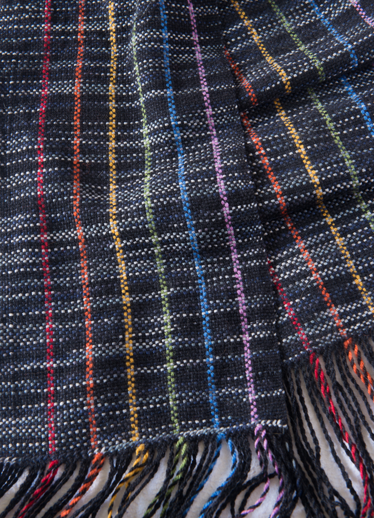 2020 Black Ice with Rainbow Stripes Scarf Black Ice with Rainbow Stripes Scarf Fibers: Extra-fine merino, wool, polyamideSize: 66.5″ long (76.5″ including fringes) by 9.25″ wide – Sold – Handweaving available now Have something made