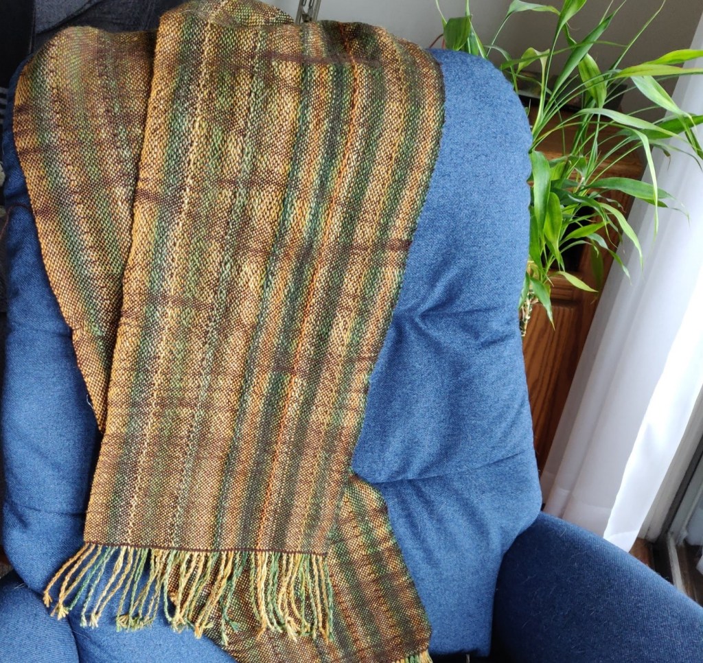 This is a rustic scarf with varied edges and the weft packed loosely in some spots and more closely in others in order to create and oranic striping effect.