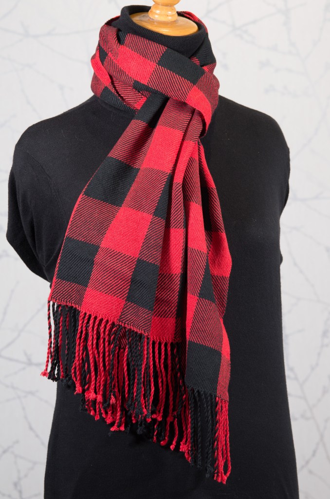 The Buffalo Plaid design of this scarf got its name because blankets in this design were once traded for buffalo hides.