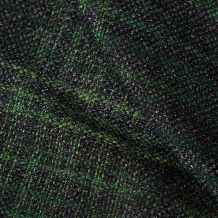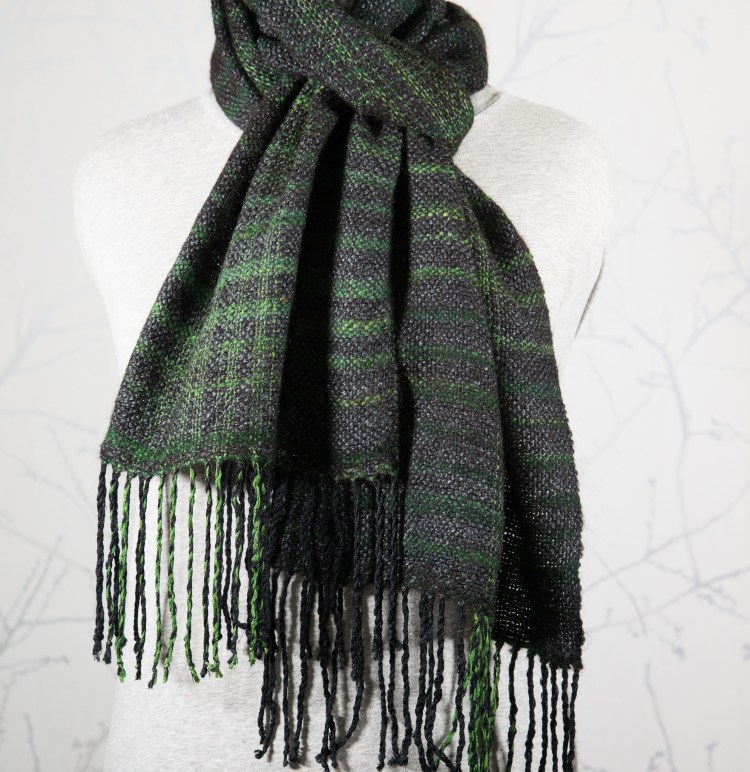 The customer who commissioned this scart told me he wanted it mostly black with some dark greens, like a forest at night time. Respondng to that I designed a hand-spun yarn from fine merino, silk, and natural black baby alpaca, and my dear wife, a talented handspinner, created it for me. The silk in the weft yarn is natural, undyed white, and makes the fiber glisten a little, like leaves in the moonlight. The baby alpaca makes a very soft yarn even softer to the touch.
